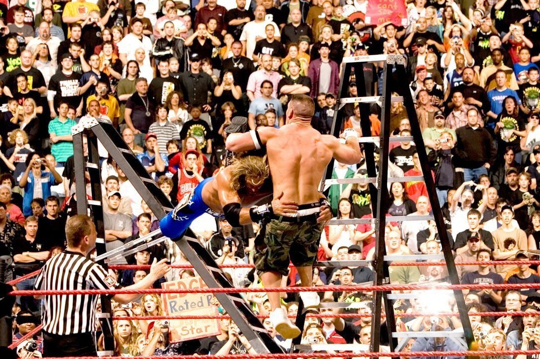Cena took a big bump from the top of a ladder, through a table at ringside, proving even WWE's golden boy was unafraid to do what was necessary to get the match over.