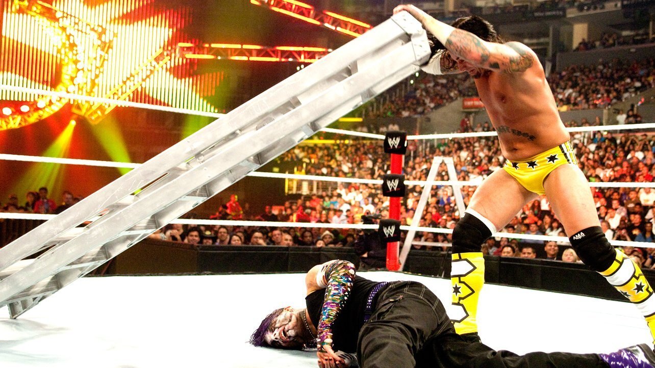 At one point, Hardy had Punk sprawled out on a table and climbed to the top of a 20-foot ladder. Launching himself off with a Swanton Bomb, Hardy crashed into Punk and through the table.